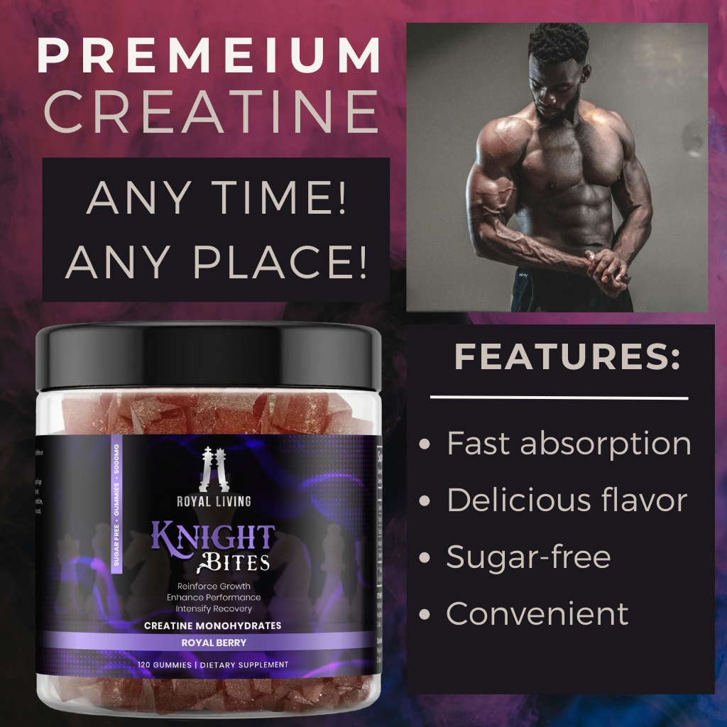Knight Bites Creatine Gummies are a deliciously innovative way to fuel your muscle-building journey in a fun and convenient form. Our tasty gummies make getting your daily dose of creatine effortless and enjoyable.